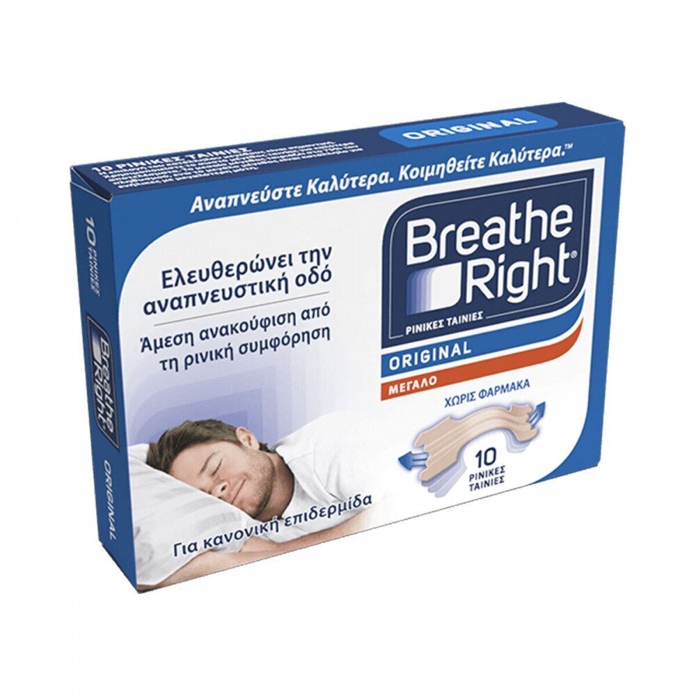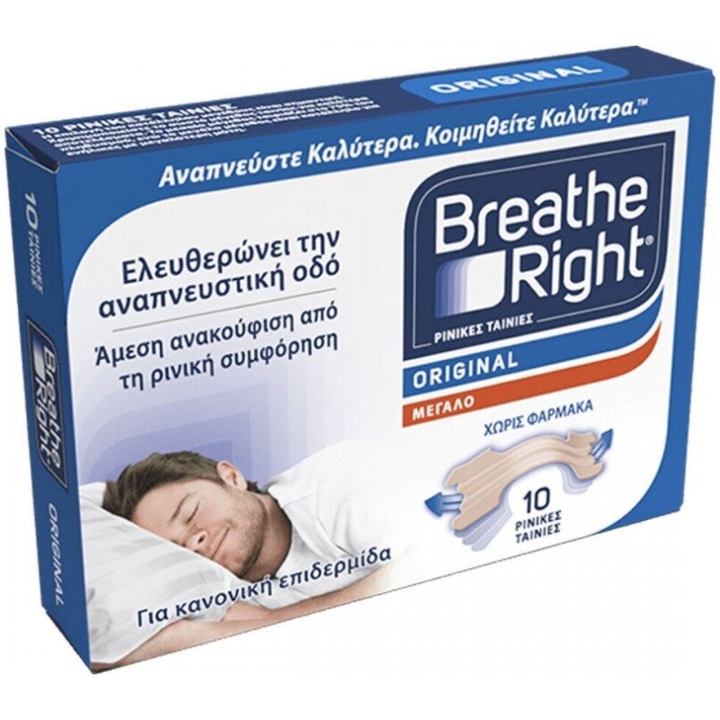 Οι ρινικές ταινίες Breathe Right, είναι κλινικά αποδεδειγμένο ότι ανοίγουν τους αεραγωγούς της μύτης και βελτιώνουν την ροή του αέρα. Αποτελούνται από δύο εύκαμπτα τμήματα τα οποία ανασηκώνουν ελαφρά και ανοίγουν τις ρινικές κόγχες βελτιώνοντας τη ροή του αέρα, ώστε να αναπνέετε καλύτερα. Οι ρινικές ταινίες Breathe Right μπορούν να χρησιμοποιηθούν μέρα ή νύχτα για να παρέχουν ανακούφιση από τη ρινική συμφόρηση που προκαλείται από τις αλλεργίες, το κρυολόγημα και το στραβό διάφραγμα.